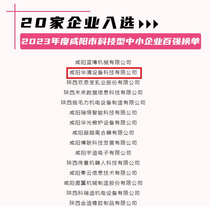 • 2024-02-20熱烈祝賀咸陽(yáng)華清設(shè)備科技有限公司榮獲2023年度咸陽(yáng)市科技型中小企業(yè)榜單